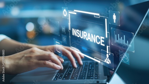Person types on laptop with insurance digital interface overlay
