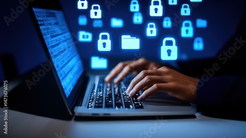 Person typing with digital security icons above shows active online defense tools supporting zero trust security, privacy, and secure data protection