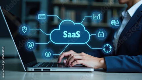 Person using a laptop with a saas cloud interface.