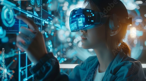 Person using AR glasses in a modern office, surrounded by floating data interfaces