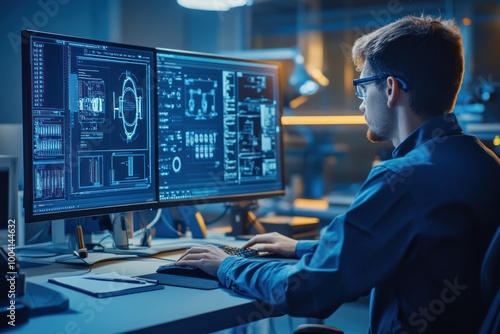 Person using dual monitors for technical software work