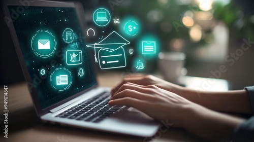 Person Using Laptop with Icons Representing Online Education and E-Learning Concepts