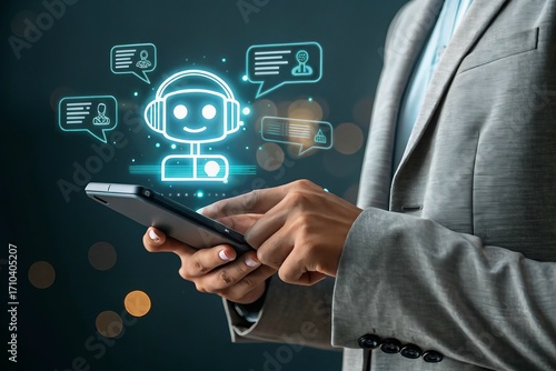 Person using smartphone interacting with glowing chatbot icon and speech bubbles representing ai communication and digital assistance