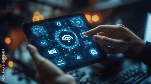 Person using tablet with glowing wifi and data icons.