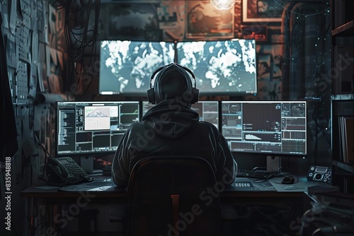Person working in a dark room with multiple screens, wearing headphones, focused on computer monitors with code and data.