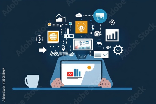 Person working on laptop with data visualization icons. Flat design, dark blue background, simple style. Charts, graphs, and symbols illustrate data