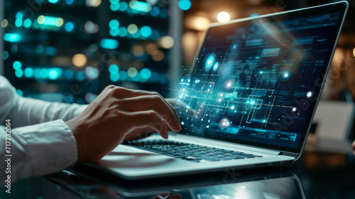 person's hands typing on a laptop with digital data streaming from the screen into a server room