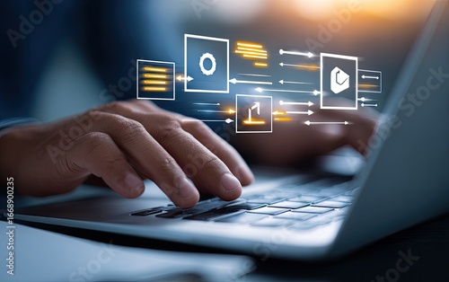 Person's hands typing on laptop, holographic data flow above. Process automation, digital transformation, technology, connectivity