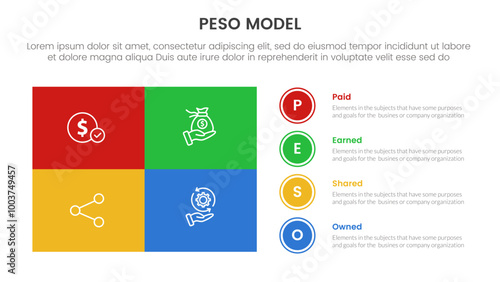 PESO Model strategic framework infographic 4 point stage template with matrix structure big union square shape and circle point stack for slide presentation