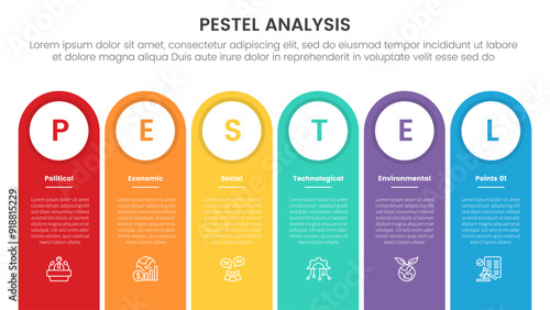 pestel business analysis tool framework infographic with round box header outline with 6 point stages concept for slide presentation