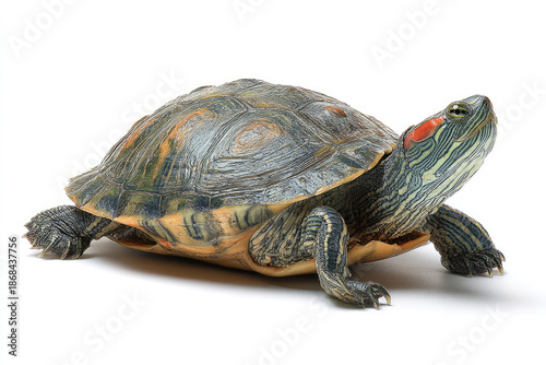 Pet turtle red-eared slider(Trachemys scripta elegans) isolated on white background