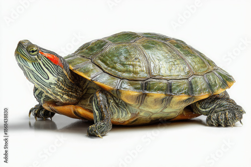 Pet turtle red-eared slider(Trachemys scripta elegans) isolated on white background