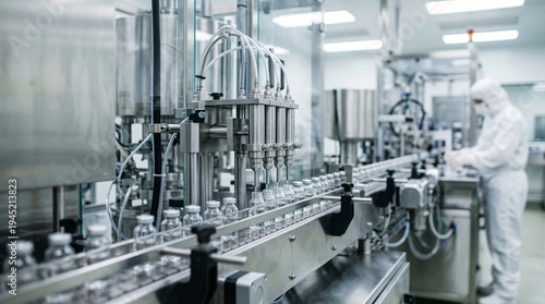 Pharmaceutical bottling and filling line with sterile equipment and worker in cleanroom