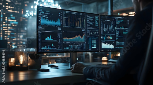 Photo, Financial Data Analysis on Multiple Monitors in Office at Night