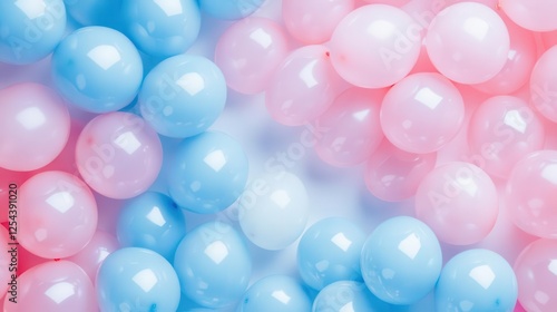 Photo of a pastel-colored background with balloons for a gender reveal party. The image features pastel colors, balloons in pink and blue, a white background, Copy space