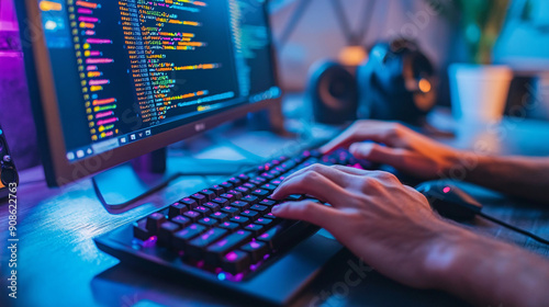 Photography of a focused programmer typing on a mechanical keyboard with a 4K monitor showcasing complex algorithms and colorful code