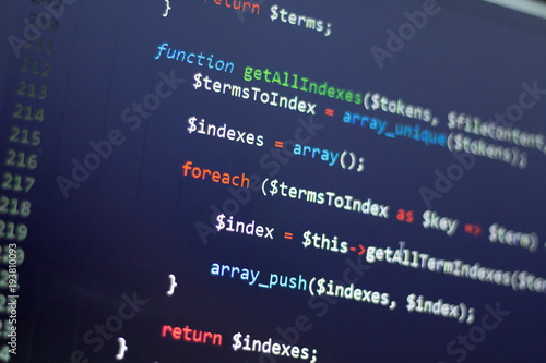 PHP back-end code. Computer programming source code. Abstract screen of web developer. Digital technology modern background. Code is created by myself.