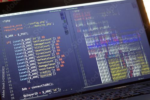PHP back-end code. Computer programming source code. Abstract screen of web developer. Digital technology modern background. Code is created by myself.