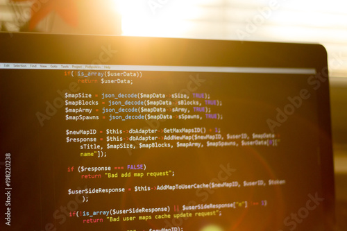 PHP back-end code in sunset rays. Computer programming source code. Abstract screen of web developer. Digital technology modern background. Code is created by myself.