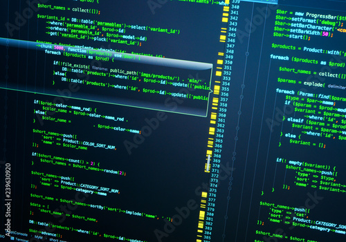 PHP code on the screen, extreme close up. Php coding on dark blue background