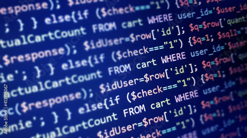 PHP programming language on computer screen. Monitor technology concept. Background of program code. Web dewelopment