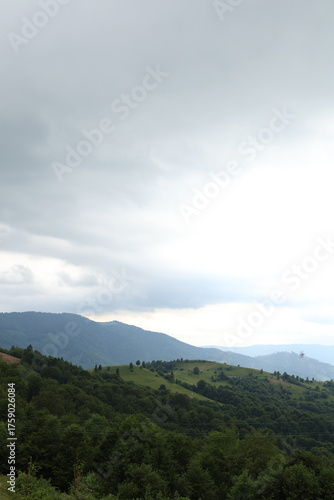 Picturesque mountain slopes under a cloudy sky.The mountains convey the natural beauty and vast expanses of the Carpathian landscape, ideal for promoting travel, tourism, ecology, and landscape design