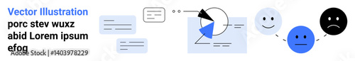 Pie chart and text data surrounded by faces indicating user feedback sentiment happy, neutral, sad. Ideal for user feedback, surveys, data analysis, reports, infographics, education simple landing