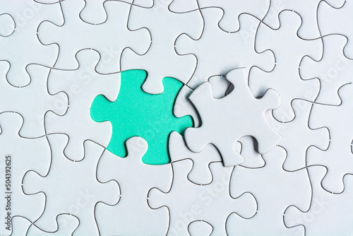 Piece of jigsaw puzzle. Flat lay, Directly above. Copy space.