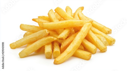 Pile of golden french fries isolated on white background. Concept of fast food, junk food, and unhealthy eating.
