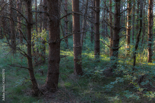 Pine forest close-up landscape late afternoon. Trunks backlit by sun rays.