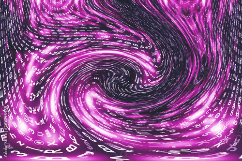 Pink matrix digital background. Distorted cyberspace concept. Characters fall down in wormhole. Hacked matrix. Virtual reality design. Complex algorithm data hacking. Pink digital sparks.