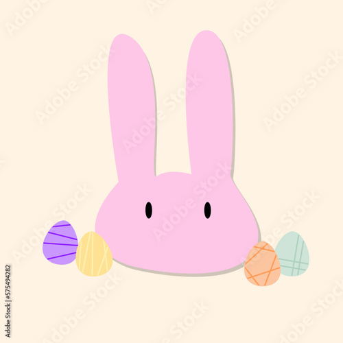 Pink rabbit with Easter eggs. Happy Easter. Yellow Background. Vector.