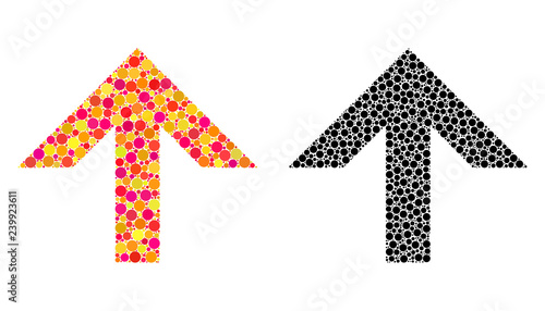 Pixel arrow up mosaic icons. Vector arrow up pictograms in multi-colored and black versions. Collages of casual circle elements.