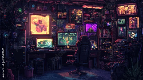 Pixel art futuristic gaming room with neon lights, ergonomic chair, and high-tech screens. Cyberpunk style gaming setup and workspace concept for digital design and technology