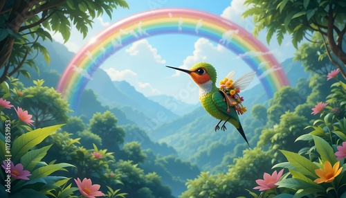 Pixel Art Hummingbird in Tropical Rainforest with Rainbow