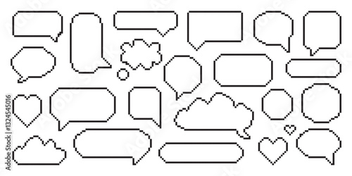 Pixel art speech bubbles set. Collection of pixel elements. Comic chat pixel elements. 8-bit style illustration.