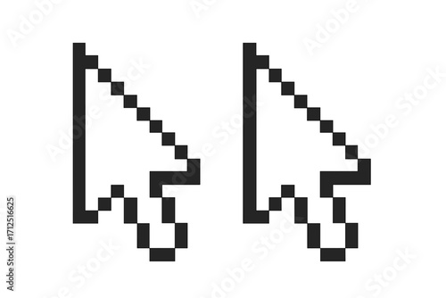 Pixel cursor icon set. Arrow pointer symbol for computer mouse. Retro 8-bit graphic design element. Digital navigation sign for web interface or GUI. Vector illustration.