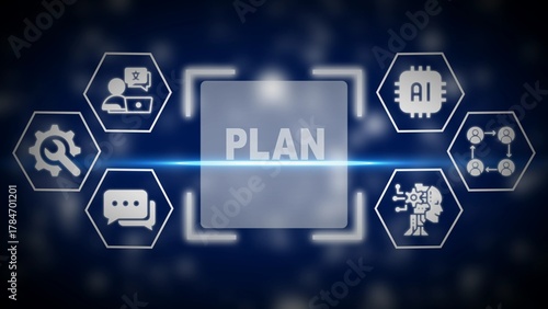 Plan concept with surrounding icons representing AI machine learning and business processes on a dark blue background