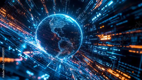 Planet earth rotating with digital data flowing around it