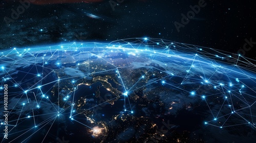 planet with a network of lines connecting it to other planets. Connections system and global datas exchanges over the globe 3D rendering elements of this image