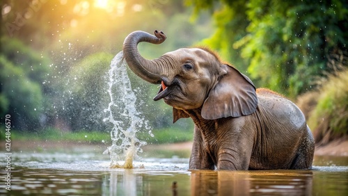 Playful Young Elephant Splashing Water in Sunlit River Scene