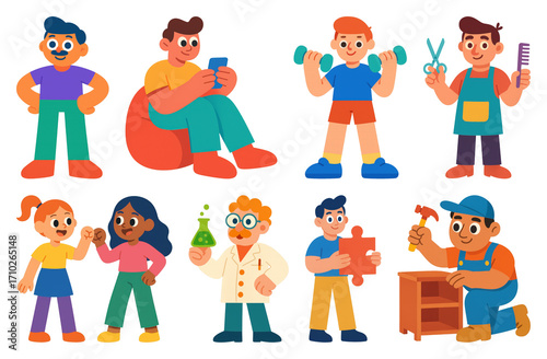 PNG Colorful cartoon characters in various activities, element set on transparent background
