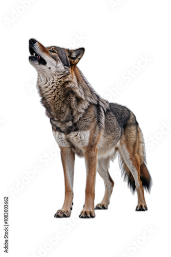 白い背景で遠吠えするオオカミの全身が放つ野生的な威厳と迫力。PNG,生成AI