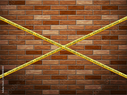 Police line tape on bricks background. Vector illustration.