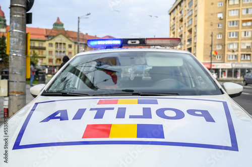 Police patrol car in Romania with flashing lights. Front view of a police car with the lettering "Police".