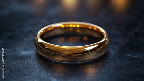 Polished gold wedding band on dark surface.