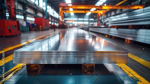 Polished Steel Sheets in Factory. Rows of polished steel sheets in a factory setting, showcasing their readiness for industrial applications.