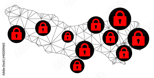 Polygonal mesh lockdown map of Tokyo Prefecture. Abstract mesh lines and locks form map of Tokyo Prefecture. Vector wire frame 2D polygonal line network in black color with red locks.