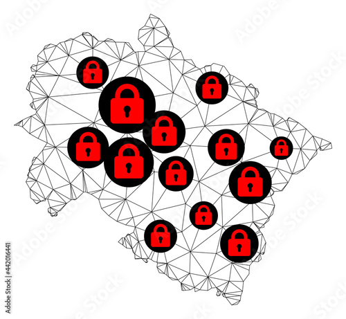 Polygonal mesh lockdown map of Uttarakhand State. Abstract mesh lines and locks form map of Uttarakhand State. Vector wire frame 2D polygonal line network in black color with red locks.