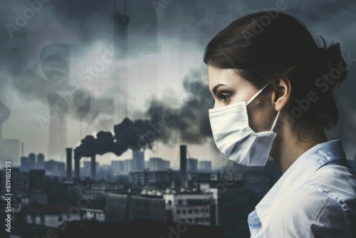 Poor health due to air pollution. A woman protects herself with a mask from industrial emissions. Environmental protection concept.